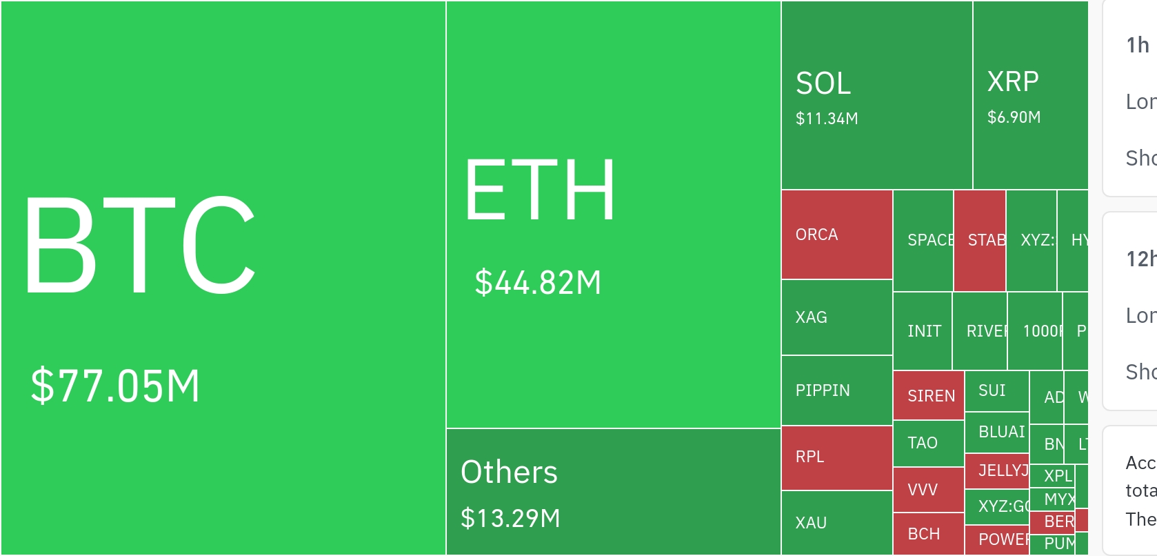 加密货币市场大规模清算事件 在过去24小时内,加密货币市场发生了价值约1.534亿美元的杠杆头寸清算。已汇总的数据显示,被清算的头寸中大部分为多头仓位,同时整个市场的波动性呈现加剧态势。 主流币种清算情况 按币种来看,比特币相关头寸清算规模最大。24小时内,比特币头寸清算金额约达7705万美元,占整体清算规模的一半以上。以太坊在24小时内清算额约为4482万美元,位列第二。 其他币种市场表现 SOL在24小时内清算额约为1134万美元。以4小时为基准,其多头头寸清算82.94万美元,空头头寸清算142万美元。目前SOL价格微涨0.40%。 XRP在24小时内发生约690万美元清算,当前价格 -