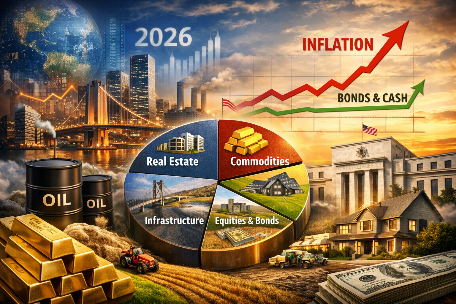 2026年全球投资格局的结构性转变2026年的全球投资格局,已从2008年后标志性的低通胀、低利率环境,明确转向以持续价格波动、财政扩张和供应端约束为特征的新体系。随着股票与固定收益资产间传统的分散化关系面临前所未有的压力,纳入实物资产(即具有内在价值的有形实体资产)已从战术考量转变为机构的战略必要。这类资产的对冲通胀效力不仅源于其物理属性,更植根于复杂的宏观经济机制,包括重置成本动态、合约收入随通胀调整,以及其所提供服务的必需性。本报告结合2026年宏观经济展望,分析了商业地产、基础设施、农田和商品等主要通胀保护工具,评估其机制、历史表现及在现代投资组合中的整合方式。2026年宏观经济体系:2026-01-24