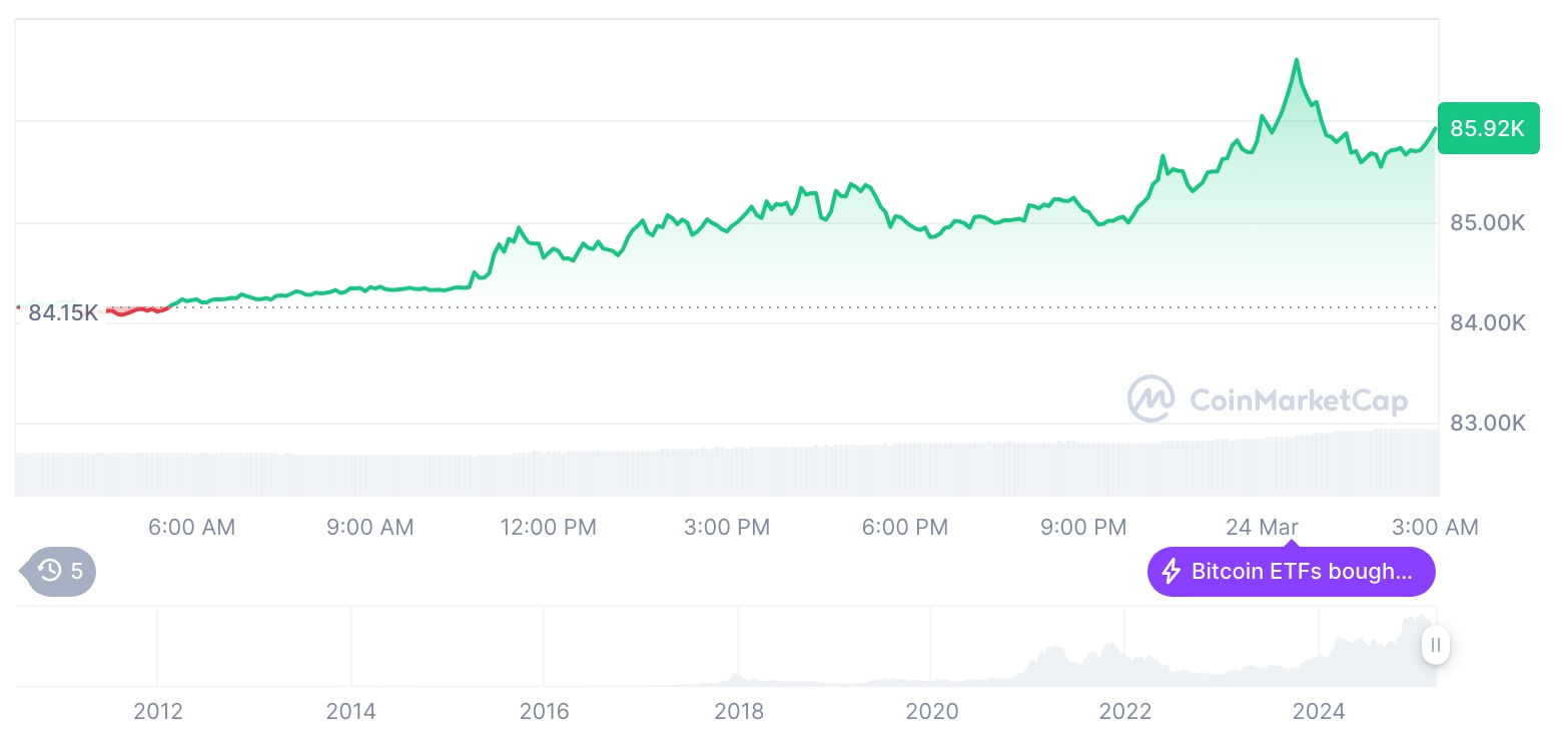 《午后市场速报:加密货币市场震荡,比特币报85,920美元,以太坊1,992美元》