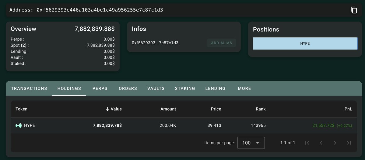鲸鱼 0xf562 存入 7.86M $USDC 到 Hyperliquid 以 39.3 美元的价格购买 200,042 $HYPE。