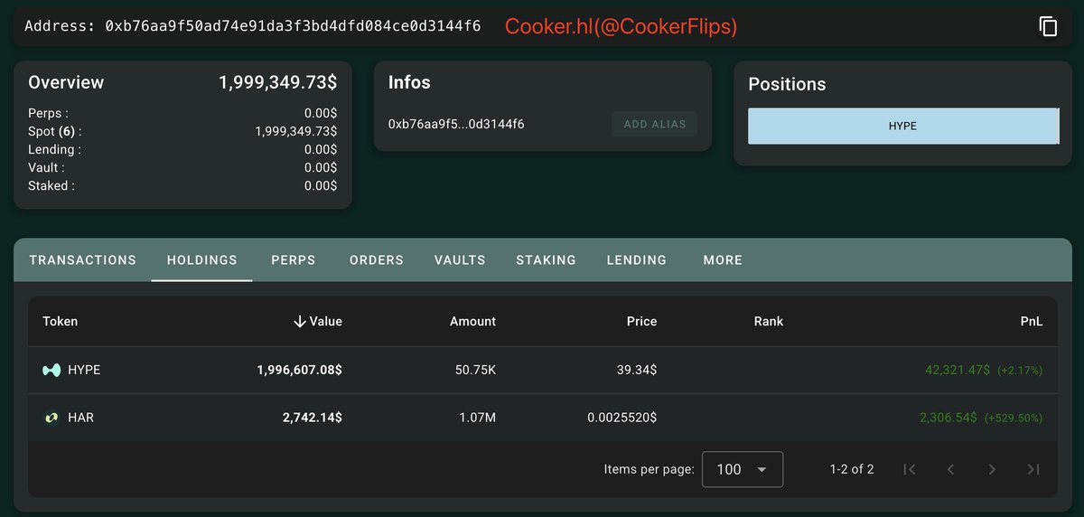 Cooker.hl (@CookerFlips) 以 38.5 美元的价格购买了 50,751 $HYPE(1.99M 美元)。