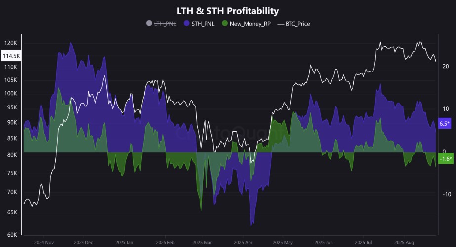 经典市场洗盘正在上演 链上数据显示,新进比特币投资者正在亏损离场,而经验丰富的持有者正在吸收抛售筹码。这并非系统性走弱的信号,而是对投机杠杆的建设性出清,将增强市场基础。 新入场者承压 亏损压力完全集中在市场最新参与者身上。持币不足一个月的投资者目前平均承受-3.5%的未实现亏损。他们的反应非常明确:正在抛售。该群体持币量近几周的显著下降印证了这一点。这是典型的恐慌性割肉行为。 老手稳守阵地 与此形成鲜明对比的是,更广泛的短期持有者群体仍保持韧性并实现盈利,整体未实现利润达+4.5%。这表明虽然绝对新手被迫出局,但持币1-6个月的投资者不仅坚守阵地,还保持着可观的盈利。短期持有者总供应量的2025-09-01