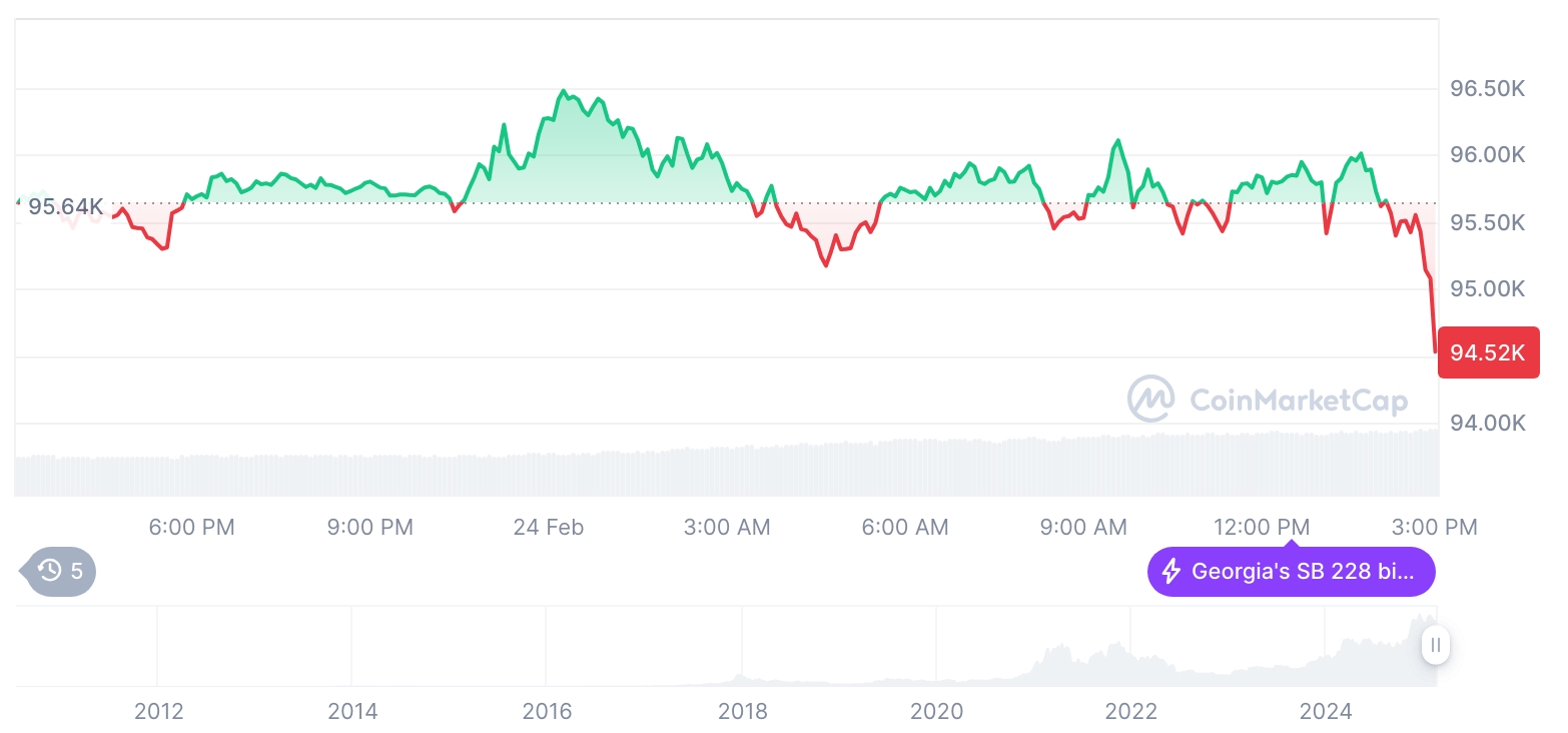 【午夜行情简报】加密货币市场持续走低,比特币报94,614美元,以太坊跌至2,657美元