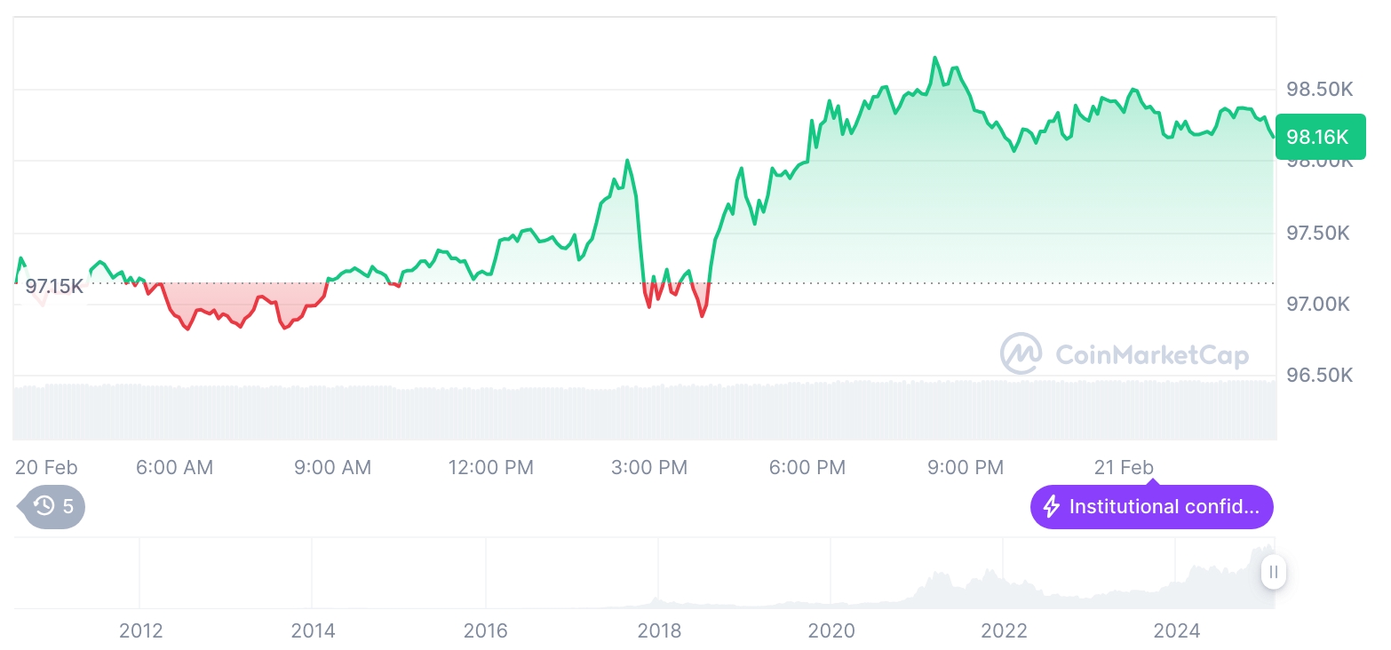 【午后行情简报】加密货币市场震荡调整:比特币报98,152美元,以太坊2,736美元