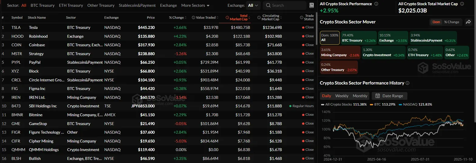 加密货币相关上市企业全线回升 数据显示,10日(当地时间)加密货币股票总市值达2.025万亿美元,较前一日上涨2.95%。随着上周调整趋势的缓和,交易所和企业持有加密货币板块迎来买盘增长。 板块表现分化 比特币持仓板块以79.4%的占比领涨3.26%,交易所板块上涨3.55%,稳定币与支付板块微升0.31%,以太坊持仓板块增长1.48%,其他板块整体上扬2.61%。但矿业板块下跌2.16%,其他持仓板块下滑2.07%。 重点企业走势 比特币持仓企业中,特斯拉(+3.66%)、Coinbase(+2.84%)和Block(+2.06%)表现强劲,唯MicroStrategy(-1.26%)小 -
