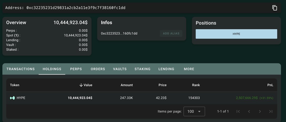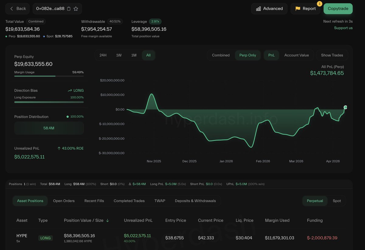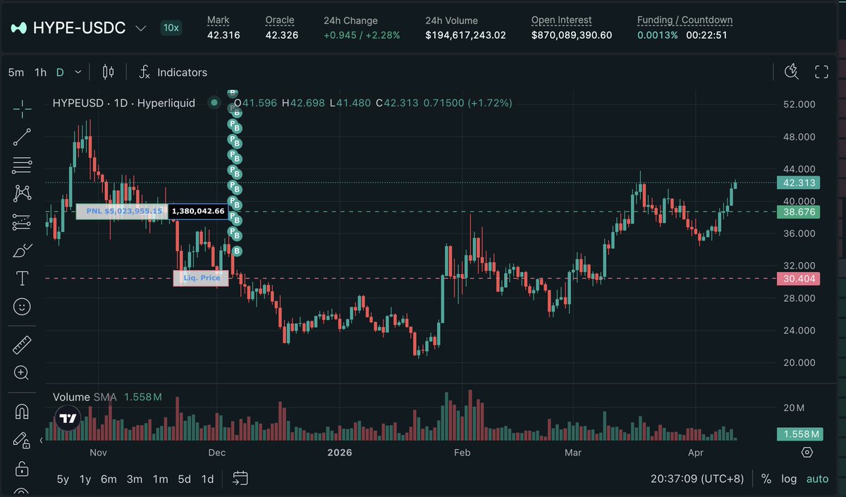 交易员 0x082e 在4个月前以38.68美元的入场价对138万$HYPE(5840万美元)开了5倍多头,成为链上最大的$HYPE多头。