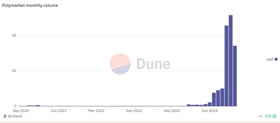 去中心化预测市场"Polymarket"交易量首次出现月度下滑 随着2024年11月大选季节的到来,去中心化预测市场"Polymarket"在经历繁荣后,首次出现自4月以来的月度交易量下滑。根据30日Dune Analytics(@rchen8)的数据显示,Polymarket在12月的交易量为17亿美元。 Polymarket是一个基于区块链的平台,用户可以在该平台上对政治、体育、金融等多个领域进行预测。在11月大选热情高涨的推动下,该平台交易量大幅攀升,10月交易额达到22.8亿美元,11月25日更是创下25.77亿美元的高点。然而,自4月以来持续攀升的月度交易量在经过约8个月的增长后2024-12-30 -