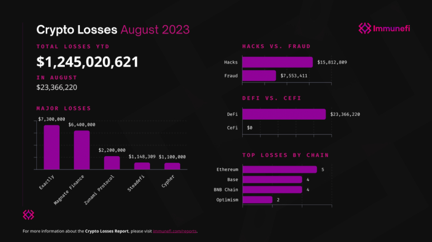 Web3生态系统遭受重创:2023年损失超12.5亿美元 据安全公司Immunefi最新报告显示,2023年Web3生态系统共遭受211起攻击,造成约12.5亿美元(约合1.6528万亿韩元)的损失。 8月损失概况 仅8月份一个月,就因黑客攻击和事故损失了2336万美元的加密货币。其中,损失最严重的协议是Exactly,损失资金达730万美元。紧随其后的是Magnate Finance(640万美元)和Junami Protocol(220万美元)。 主要攻击目标 Coinbase的以太坊Layer2解决方案"Base"自9日推出以来,已有4个项目遭受攻击。继以太坊(5起)和BNB链(4 -