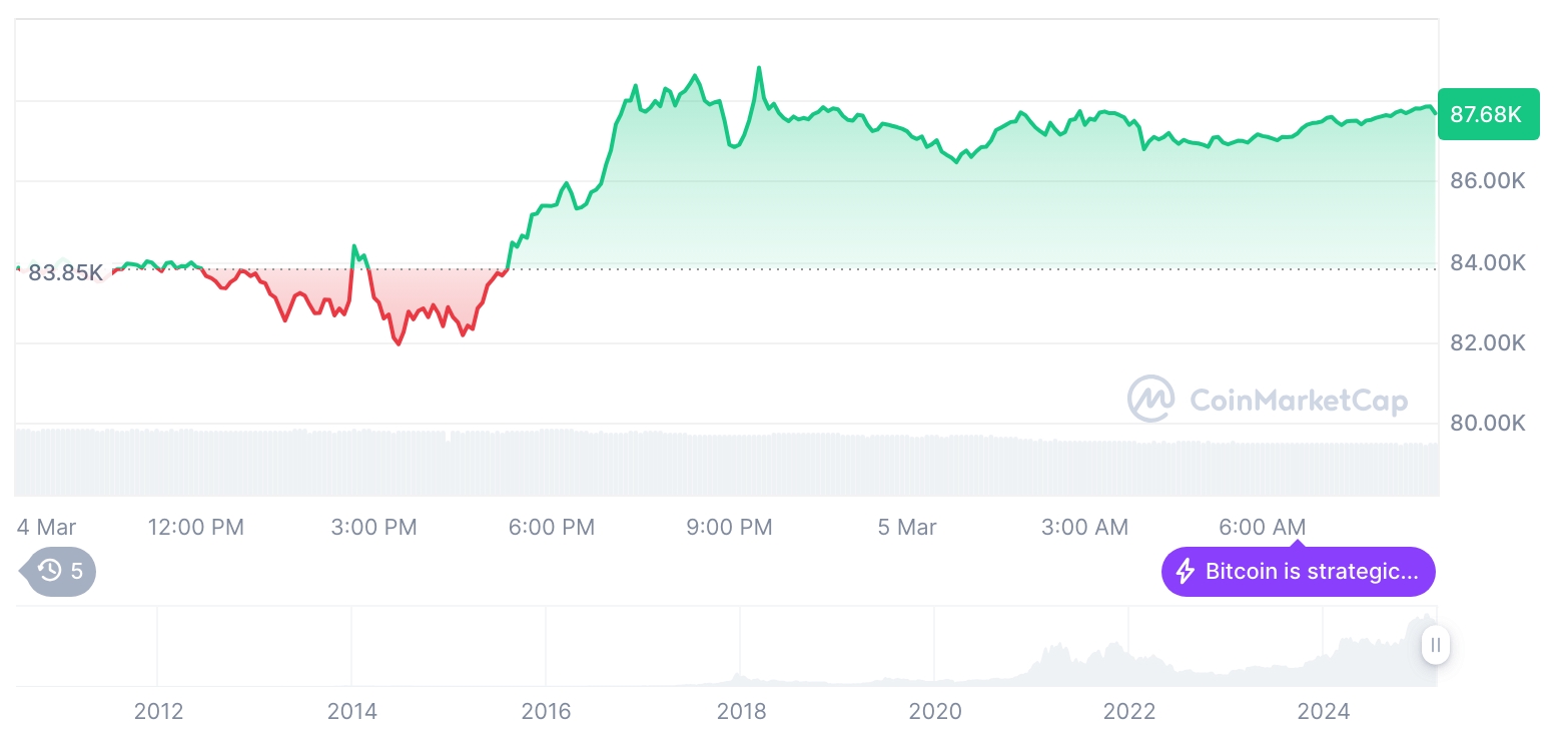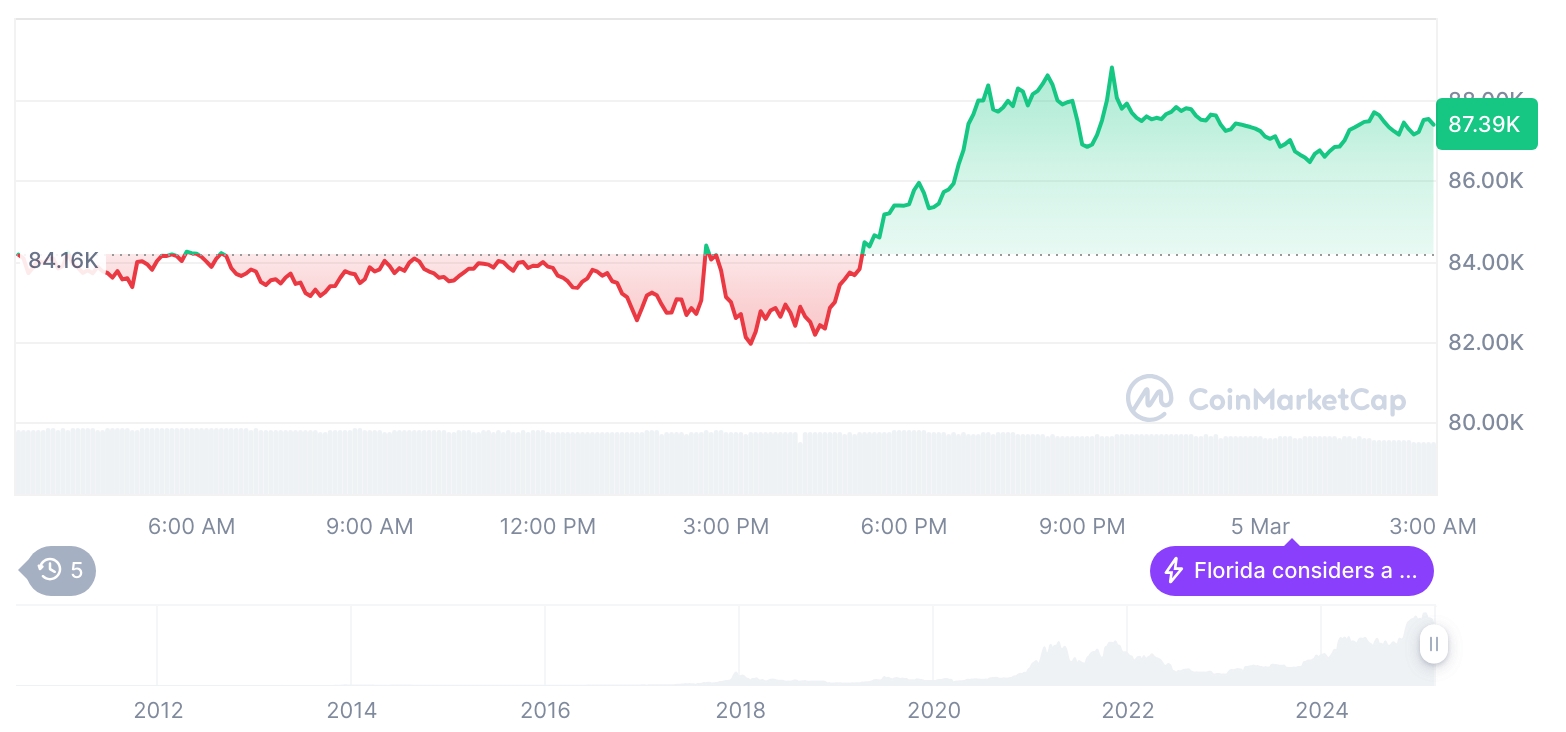 【午后行情速递】加密货币市场持续走高,比特币突破87,396美元,以太坊站上2,179美元