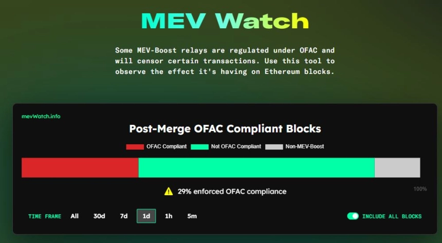 以太坊区块遵循美国财政部制裁措施的比例大幅下降 根据显示以太坊区块OFAC制裁执行率的平台"MEV Watch"11日的数据,执行制裁状态的以太坊区块比例从去年11月的80%下降至27%。 MEV策略与MEV Boost软件 验证者和矿工通过重新安排区块内的交易来最大化区块生产中的可提取价值,这种策略被称为"最大可提取价值(Maximum Extractable Value, MEV)"。在以太坊权益证明区块链中,为了提高MEV,使用了名为"MEV Boost"的开源软件,同时也会使用生成待发送交易集的"中继软件"。 制裁事件的背景与影响 2022年8月,美国财政部OFAC将干扰加密2023-05-11