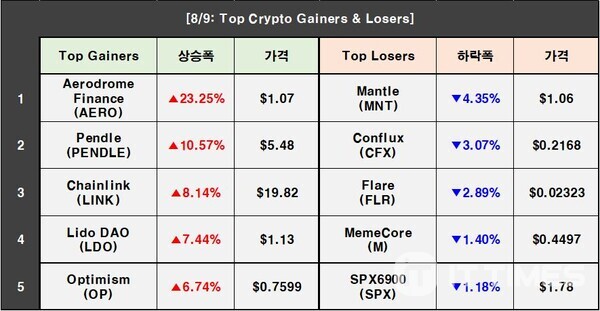 8月9日加密货币行情:比特币微跌0.22%,AERO暴涨23.25%