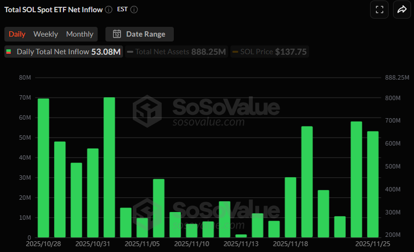 SOL现货ETF市场自上市以来已连续21个交易日保持资金净流入。根据最新数据统计,当地时间25日美国SOL现货ETF市场单日净流入金额达5308万美元。自上月28日启动交易以来,该市场持续呈现资金净流入态势,期间未出现任何单日资金流出,累计净流入规模已扩大至6.2132亿美元。
