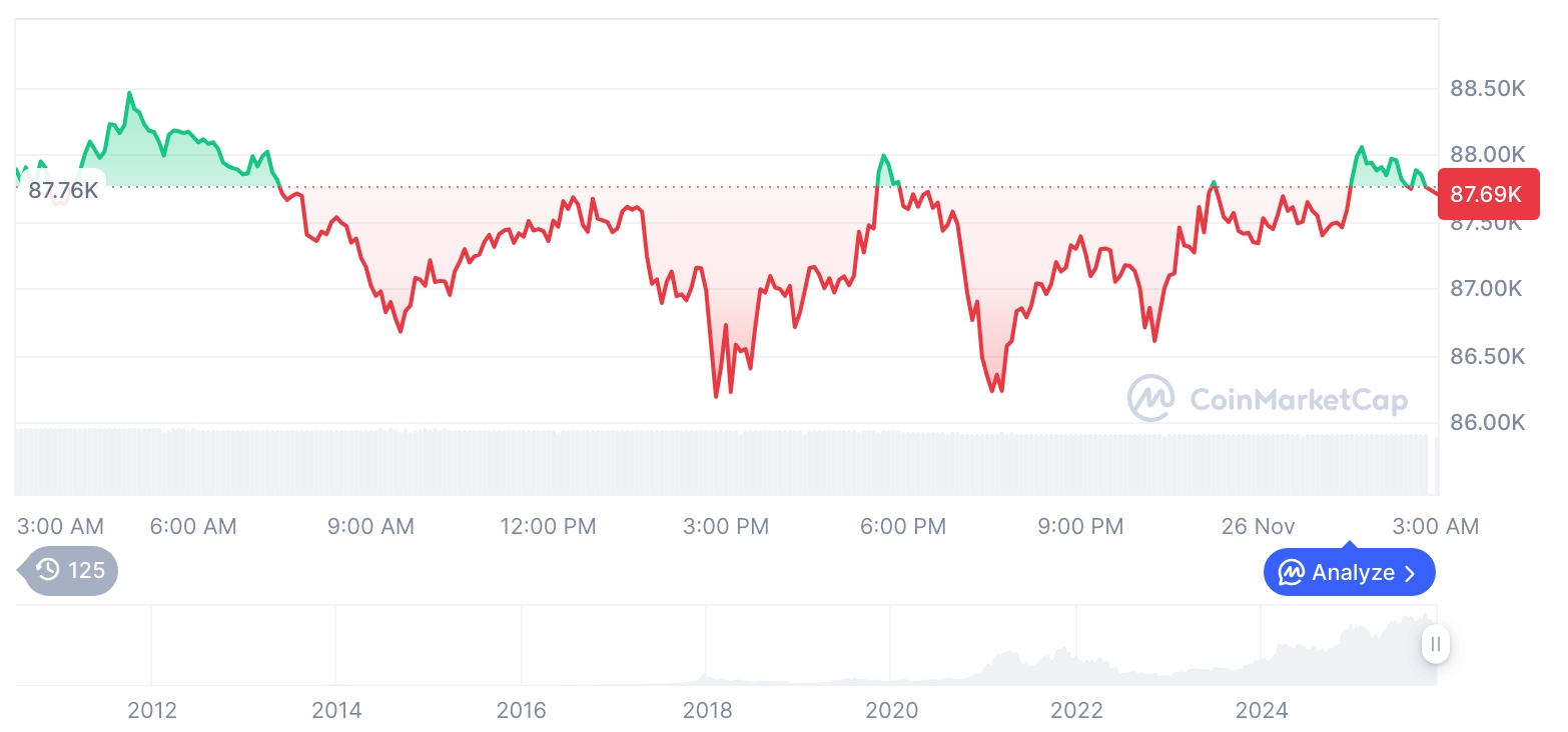 [午后行情简报]加密货币市场震荡分化……比特币报87,670美元,以太坊收于2,955美元