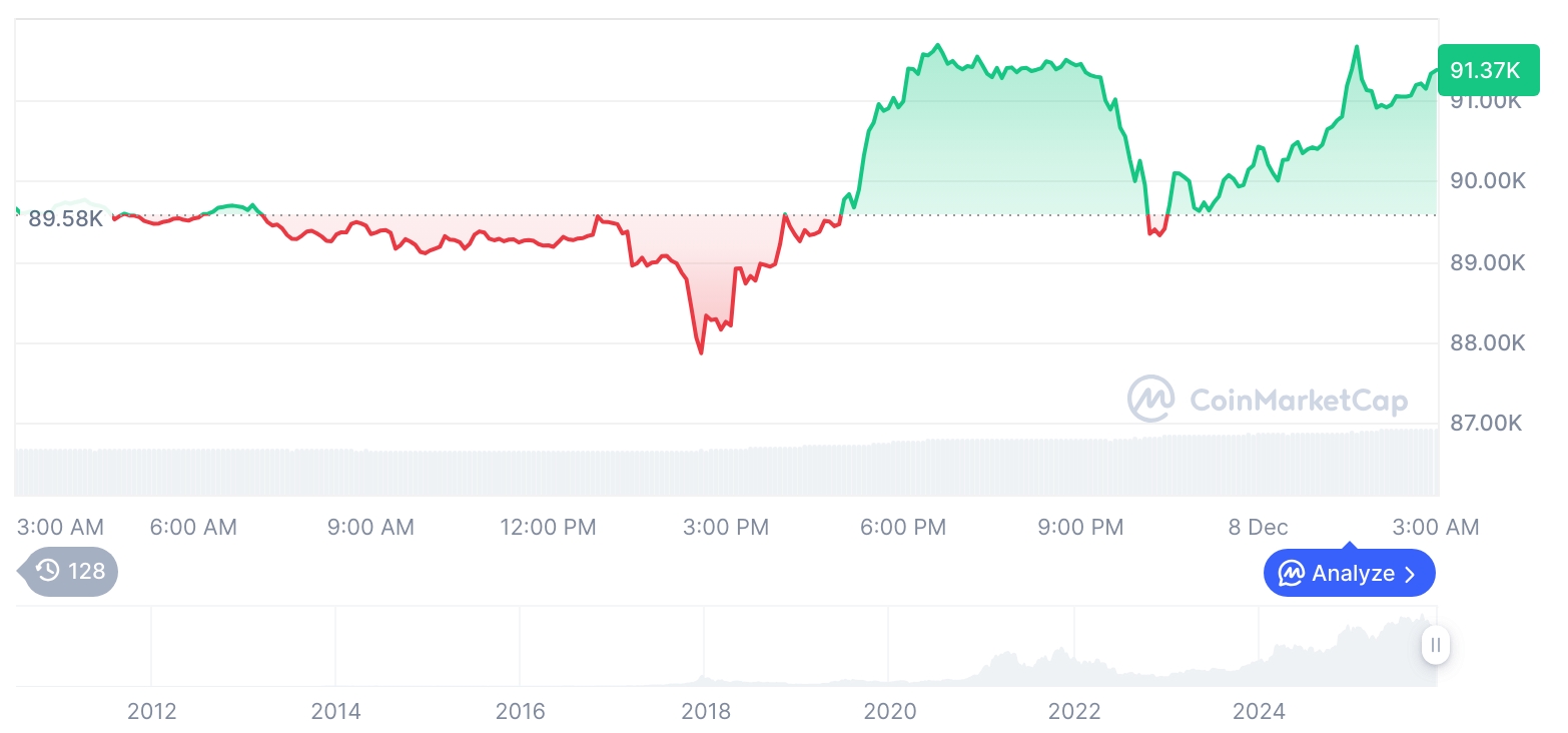 [午后行情简报]加密货币市场普涨:比特币报91,379美元,以太坊冲上3,110美元