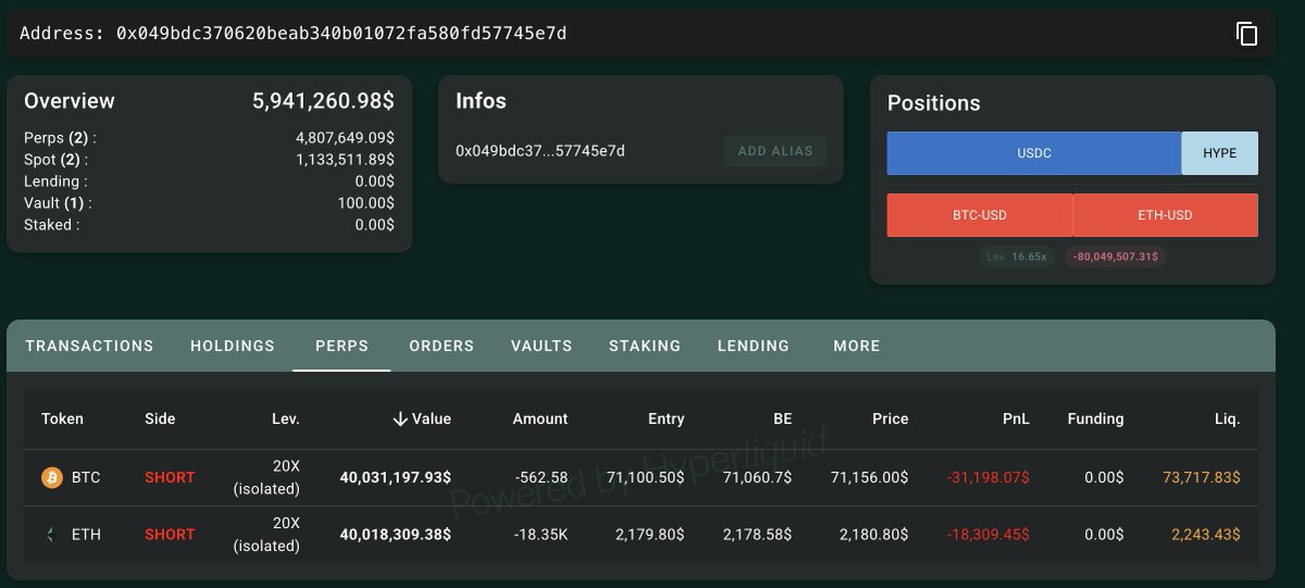 在过去30分钟内,他开了20倍空单,做空562.58 $BTC(4000万美元)和18,350 $ETH(4000万美元)