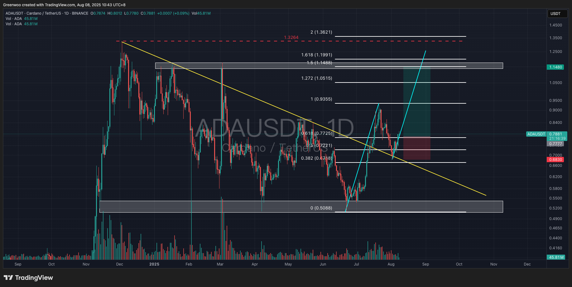ADA 在突破持续半年多的下降三角形形态后,ADA在0.935美元附近遭遇阻力,随后回撤测试支撑位,在0.684美元附近低点获得反弹。此次回调路径相当清晰,价格完美地从趋势线反弹。 截至撰稿时,ADA暂报0.785美元。尚未入场的投资者可考虑以现价建仓多头,阶段止盈目标可设置在1.05美元、1.148美元和1.32美元,止损位可置于支撑位0.684美元下方。 参考价位: 方向:多头 建仓:0.785美元(现价)/0.777美元 止盈:1.05美元/1.148美元/1.32美元 止损:0.683美元 LINK 日线图显示,LINK自2025年4月初以来一直处于上升通道(紫色平行通道)中,整体 -
