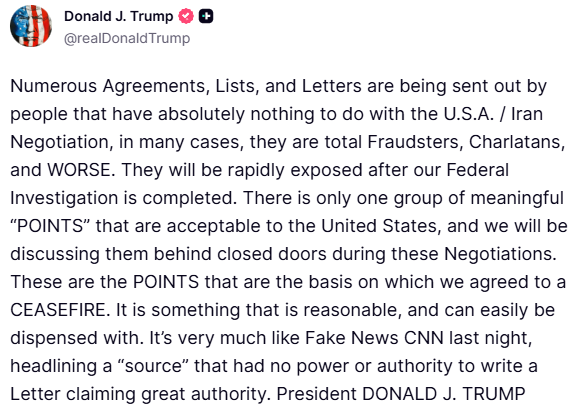 伊朗停火协议极其脆弱,特朗普强调10点差异;周五与巴基斯坦的直接会谈仍在进行