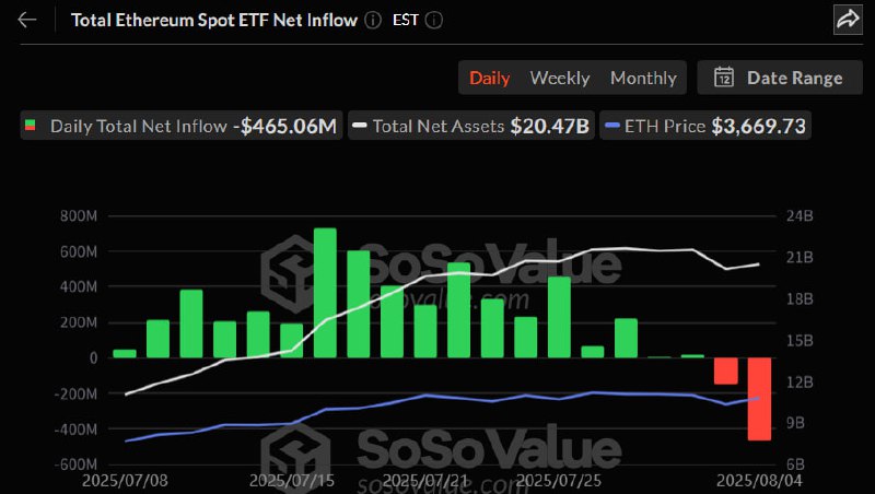 美国比特币及以太坊ETF资金大规模外流 8月4日(当地时间)数据显示,美国现货比特币ETF出现3.33亿美元资金净流出,其中仅贝莱德的IBIT产品就流失2.92亿美元,占整体流出规模的绝大部分。 以太坊ETF同步承压 以太坊ETF市场同样面临资金撤离,单日净流出达4.65亿美元。贝莱德旗下ETHA产品录得3.75亿美元资金外流,成为该市场的主要流出渠道。 市场背景分析 这类ETF产品原本是机构投资者与个人投资者间接参与加密货币市场的重要工具。但近期受市场波动加剧、加息预期升温等因素影响,投资情绪明显降温,最终导致大规模资金撤离现象 -