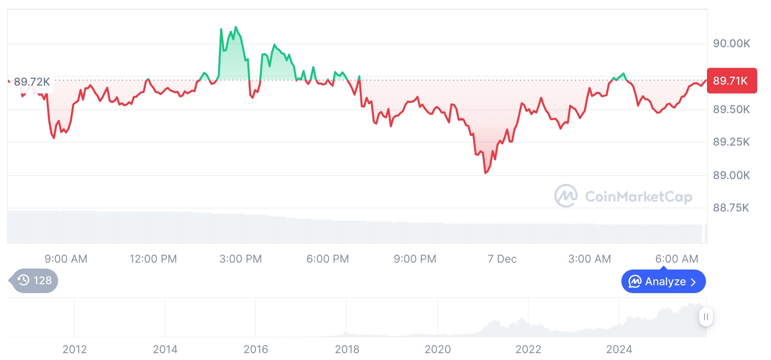 加密货币市场涨跌互现:比特币报89,702美元,以太坊持稳3,048美元
