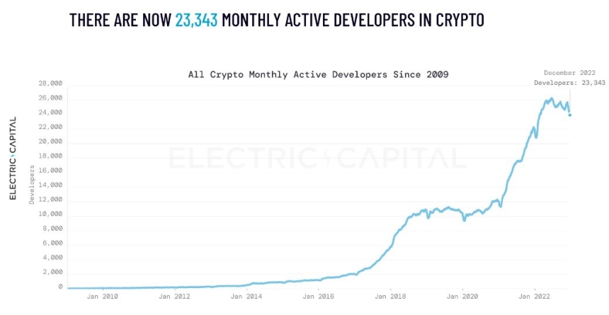 加密行业开发者数量持续增长,新兴生态蓬勃发展 知名投资机构Electric Capital于当地时间17日发布的《2022年开发者报告》显示,截至2022年12月,加密行业月度活跃开发者数量已达22,343人。这一数字较开源加密货币问世初期的1,000人水平实现了显著增长。 开发者数量逆势增长 报告对9,000多个生态系统和163,000多个加密货币专业代码库进行了深入分析。数据显示,尽管去年加密货币价格下跌约70%,但月度活跃开发者数量仍实现了5%的增长。在开源加密货币领域,每月进行的代码变更(code commit)超过47.1万次。其中,全职开发者数量增长了8%,这些开发者贡献了全部 -