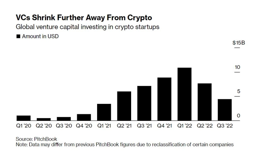 加密货币市场遇冷:风险投资大幅缩水 在全球宏观经济形势动荡的背景下,加密货币初创企业正面临严峻挑战。据研究机构PitchBook的数据显示,2022年第三季度,加密货币领域的风险投资规模已跌至年内最低水平。 投资规模锐减 根据彭博社12日(当地时间)报道,今年第三季度全球风险投资公司对加密货币初创企业的投资总额为44.4亿美元(约合6.342万亿韩元),较去年同期下降了37%。与今年第一季度创下的88.3亿美元(约合12万亿韩元)的历史高点相比,投资规模已缩减过半。 去年新冠疫情时期,为刺激经济而释放的大量流动性推动了加密货币市场的繁荣。市值排名第一的比特币在去年11月飙升至历史最高点2022-10-12