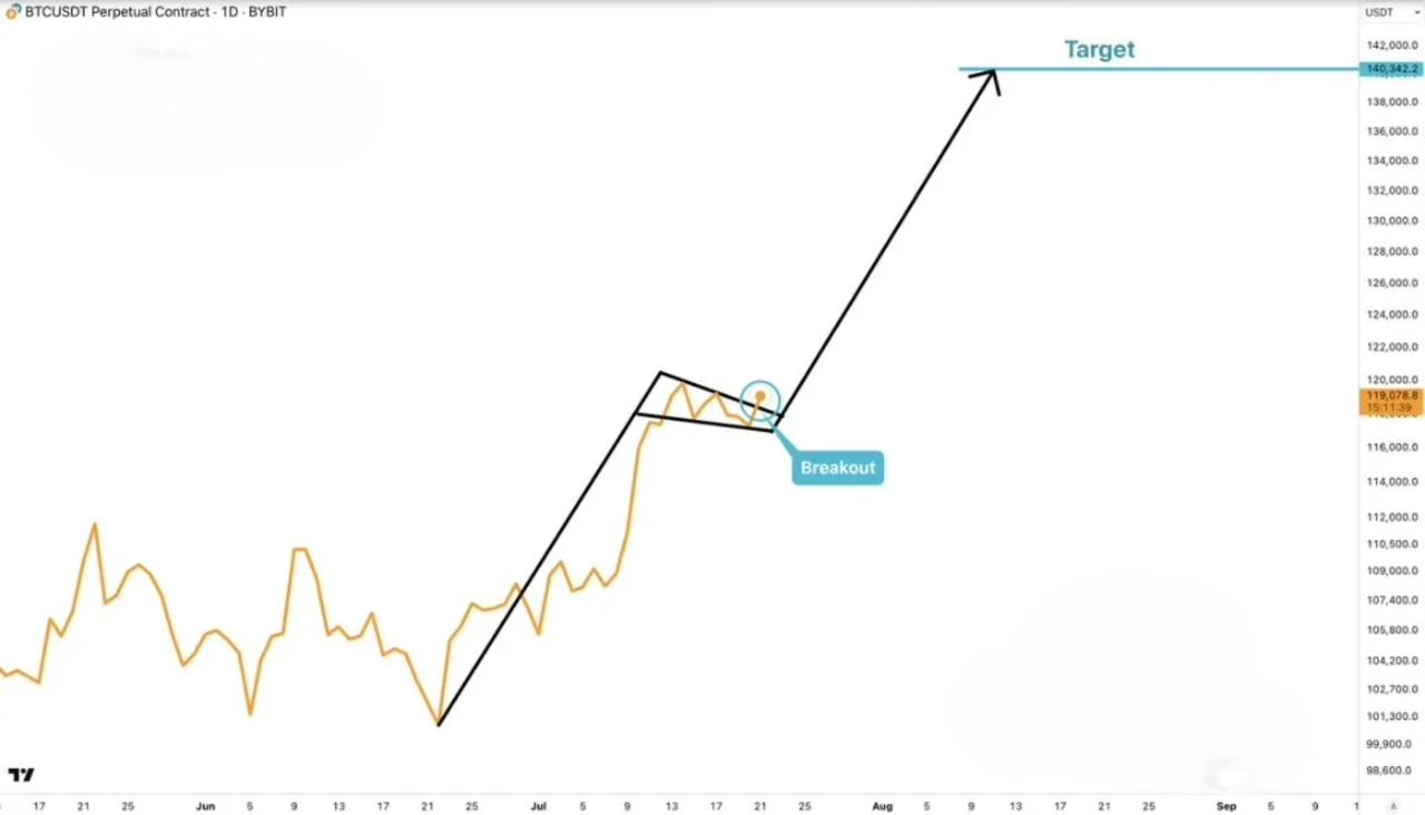 比特币"看涨三角旗"目标指向13.6万美元及更高 7月8日至上周六期间,比特币上涨14%,创下近12.3万美元的历史新高。此后,BTC价格回落,在历史高点与11.5万美元之间震荡整理。 TradingView最新数据显示,BTC目前正处于看涨三角旗形态内,暗示即将进入最后的"爆发阶段"。知名加密交易员Titan of Crypto在社交平台发文称:"比特币正处于看涨三角旗突破形态,目标价位14万美元。" 技术形态解析 看涨三角旗是价格大幅上涨后出现的持续形态,表现为在较高价位区间进行盘整。"欢迎来到本轮牛市最后也是最猛烈的阶段。"若成功突破该形态,比特币可能迎来新一轮上涨,测算目标位为2025-07-23
