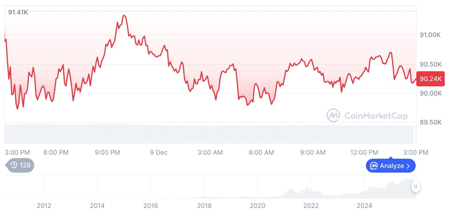 [午夜行情速递]加密货币市场走低……比特币报90,361美元,以太坊跌至3,117美元