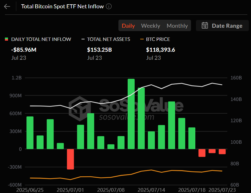 比特币ETF:7月23日关键性8600万美元资金外流挑战市场情绪 数字资产领域瞬息万变,而最能牵动市场神经的指标之一莫过于美国现货比特币ETF产品的每日资金流向。这些被视作连接传统金融与新兴加密世界的桥梁的投资工具,为机构和个人投资者的情绪提供了透明窗口。7月23日,随着这些备受瞩目的基金出现8600万美元的净流出(连续第三日呈现负面情绪),加密领域迎来了显著转变。这一关键动态对整体市场意味着什么?投资者为何似乎正在调整仓位? 数据透视:比特币ETF资金外流深度解析 7月23日8600万美元的净流出规模,相较于加密货币市场数万亿美元的总市值或许微不足道。但其真正意义在于所代表的趋势:这是2025-07-24