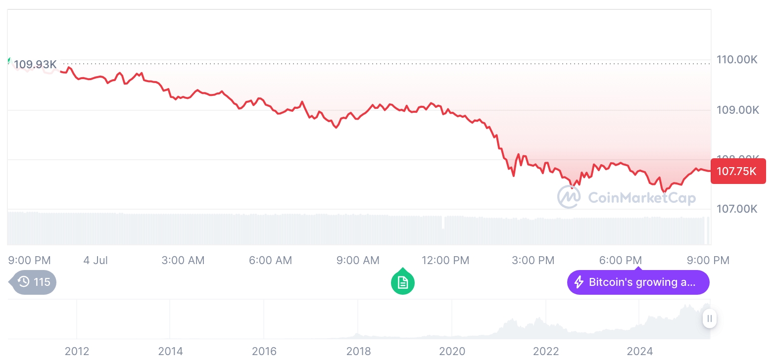 《晨间行情简报》加密货币市场持续走低:比特币报107755美元 以太坊跌至2491美元