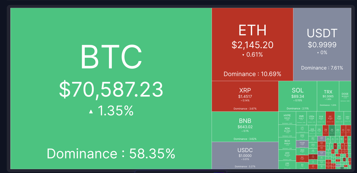 尽管中东风险与利率不确定性持续存在……比特币坚守7万美元防线,保持相对强势