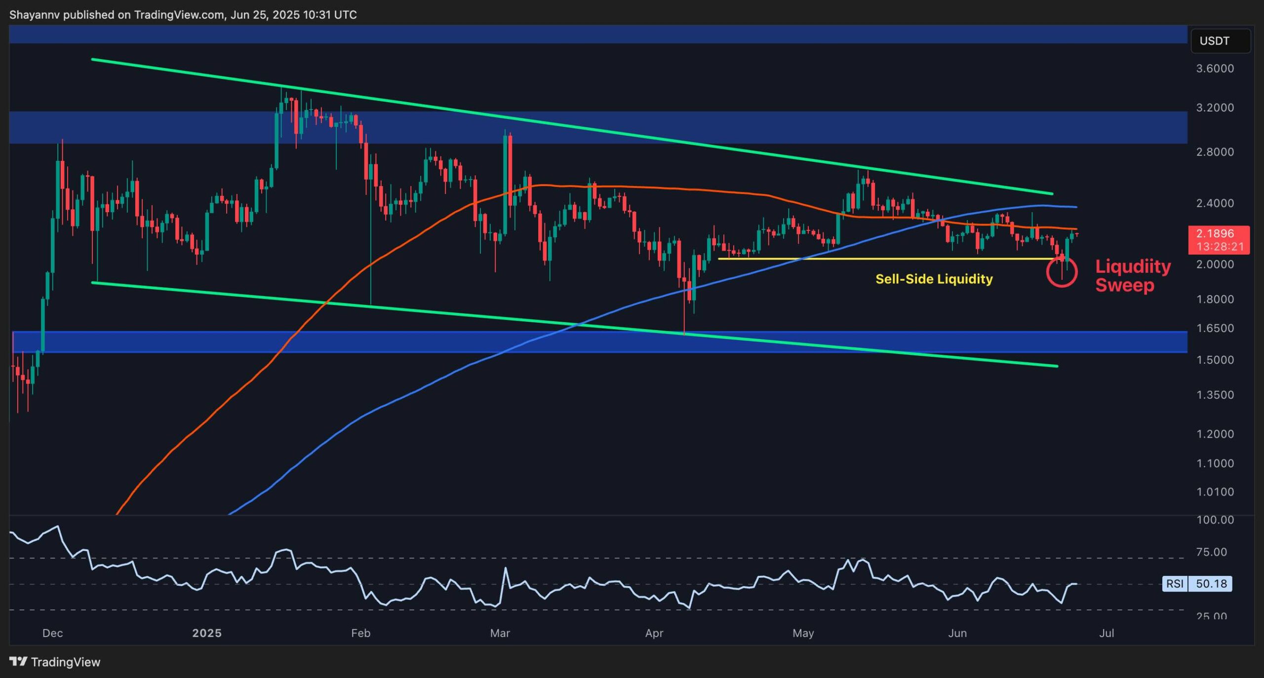 XRP在沉寂中积蓄力量 当整个市场经历剧烈波动时,XRP已悄然横盘整理数月。但近期价格走势表明,其表面平静之下可能正在酝酿变化。该资产始终坚守关键支撑位,并在XRP/USDT和XRP/BTC交易对中均显示出资金积累迹象。 XRP/USDT技术分析 XRP/USDT持续在下降通道内交易,形成连续降低的高点和低点。近期价格扫清了2美元区域下方的卖盘流动性后强势反弹,目前正在测试100日均线。这种流动性清扫后的反弹可能预示着看跌动能衰竭。 RSI指标徘徊在50中性值附近,若能重新站稳2.2-2.4美元区间的100日与200日均线,将为突破打开空间。但真正开启牛市趋势的关键,仍需有效突破通道上轨和 -