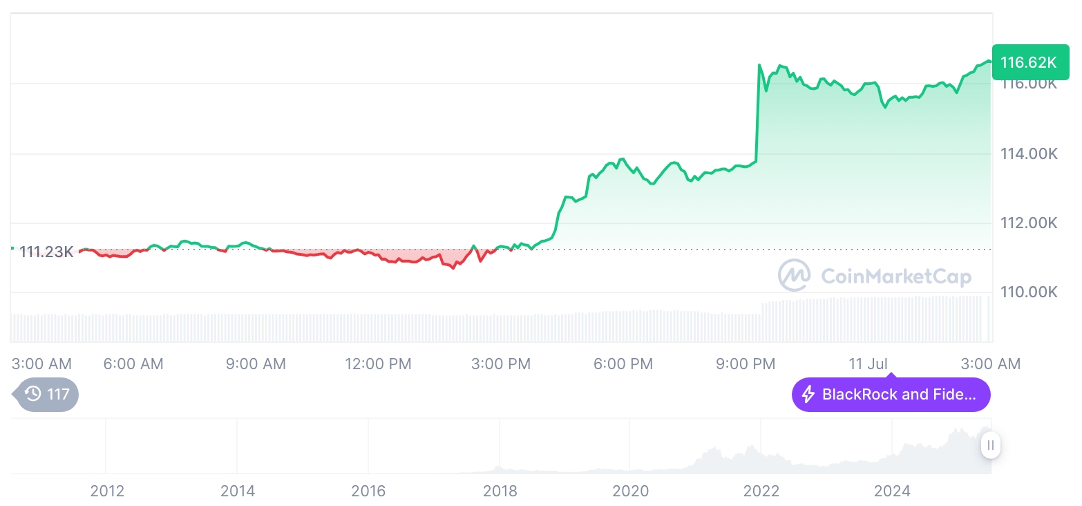 关键要点 受ETF和政策动向推动,比特币突破112,152美元关口。唐纳德·特朗普的关税声明提振市场情绪。机构资金大规模流入促成价格快速上涨。 机构参与与政策明朗化推动历史新高 比特币此次创纪录的飙升源于机构参与度的提升和政策明朗化,彰显出市场广泛的信心与参与热情。贝莱德旗下比特币信托等机构投资者,以及部分企业的战略部署成为价格攀升的关键推手。 政策与市场动态相互助推 关税政策的明确化部分缓解了市场波动,增强了投资者信心。主要交易所的活跃交易数据与部分国家财政收益案例,凸显出加密货币市场的实际财务影响力。知名企业家的公开表态进一步强化了市场积极态势,吸引更多机构关注。 市场影响与未来展望2025-07-11