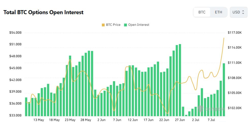 比特币衍生品市场再度显现过热迹象 比特币衍生品市场近期呈现明显升温态势,未平仓合约量与交易量双双大幅攀升,显示投资者正积极布局多头策略。 未平仓合约创近期新高 据最新数据显示,比特币期权未平仓合约总额达462.3亿美元,较前日的418.1亿美元增长约10.57%。其中看涨期权占比61.34%,看跌期权占比38.66%。 各交易所未平仓合约规模分别为:Deribit 375.4亿美元、CME 28亿美元、OKX 35.7亿美元、Binance 12.9亿美元、Bybit 10.4亿美元。 热门合约聚焦高位行权价 当前最受关注的期权合约包括:Deribit交易所14万美元看涨期权(9月262025-07-11