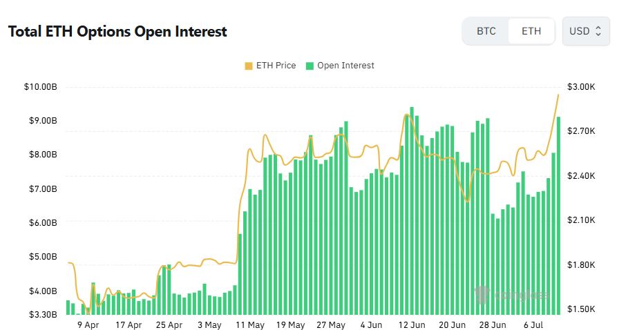 以太坊(ETH)价格飙升至2949美元 衍生品市场交易量同步激增 在以太坊(ETH)价格快速攀升至2949美元之际,衍生品市场的交易量和未平仓合约也出现显著增长,反映出市场强烈的上涨预期。 期权未平仓合约增长13% 数据显示,以太坊期权未平仓合约总额达到91.2亿美元,较前日的80.7亿美元增长约13%。其中看涨期权占比64.56%,看跌期权占比35.44%。 交易所持仓分布 各交易所的以太坊期权未平仓合约分别为:Deribit 66.5亿美元、CME 3.32亿美元、OKX 10.9亿美元、Binance 6.28亿美元、Bybit 4.19亿美元。 热门合约聚焦 持仓量最大的期权合2025-07-11