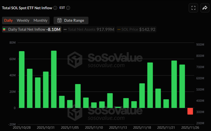 Solana现货ETF市场首现单日净流出 Solana(SOL)现货ETF市场首次出现单日资金净流出,为持续强劲的资金流入态势按下暂停键。数据显示,当地时间26日美国Solana现货ETF市场总计产生810万美元(约合118亿韩元)净流出。自10月28日上市首日至本月25日,该市场曾连续21个交易日保持资金净流入,此次是首次出现调整。累计净流入规模小幅下降至6.1322亿美元。 当日5只ETF产品中,3只呈现资金流入:Bitwise的BSOL(+1333万美元)、Grayscale的GSOL(+1042万美元)和Fidelity的FSOL(+251万美元)。21Shares的TSOL(-343 -