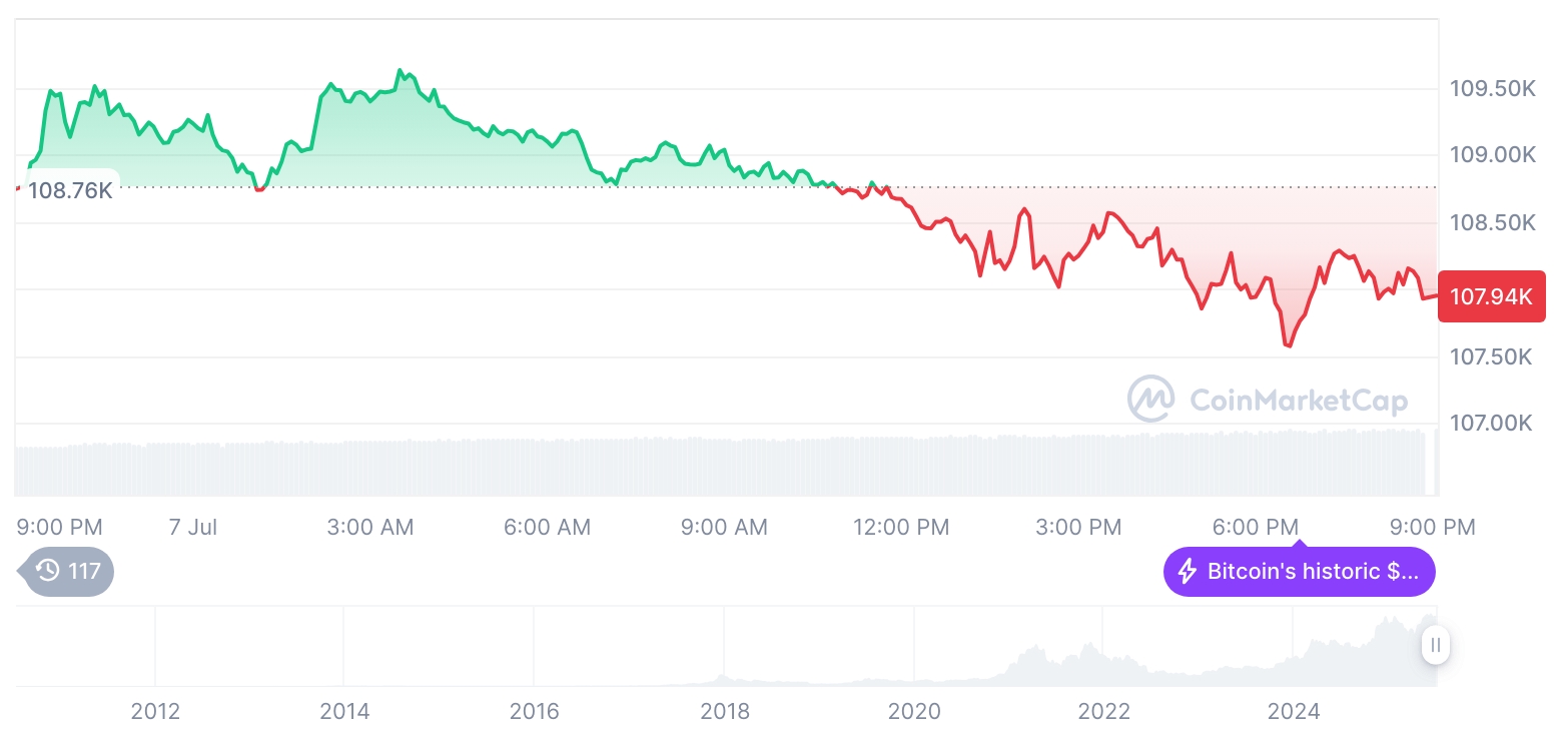 比特币坚守108,800美元上方 24小时交易量激增32% 7月7日,比特币延续前一日开始的短期上涨趋势,维持在108,800美元关口上方。此番价格走势伴随着交易量激增,同时与历史上预示市场阶段性底部的资金费率信号相吻合。 截至UTC时间7月7日上午10点,比特币报价108,874.69美元,24小时涨幅0.76%。数据显示,24小时交易量飙升32.2%至396.3亿美元,总市值达2.16万亿美元。完全稀释估值则达到2.28万亿美元。此外,成交量市值比升至1.83%,表明市场参与度活跃。 价格走势分析 本轮上涨始于7月6日中午,比特币从108,060美元开始攀升。当日晚间多次刷新日内高点,2025-07-08