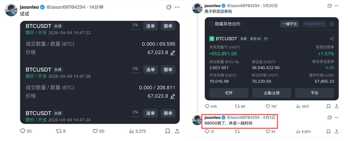 另外,他昨天表示上一次 $70016 开多的 2601.5 枚 BTC 已在 $68000 的位置止损,预计亏损 524.7 万美元