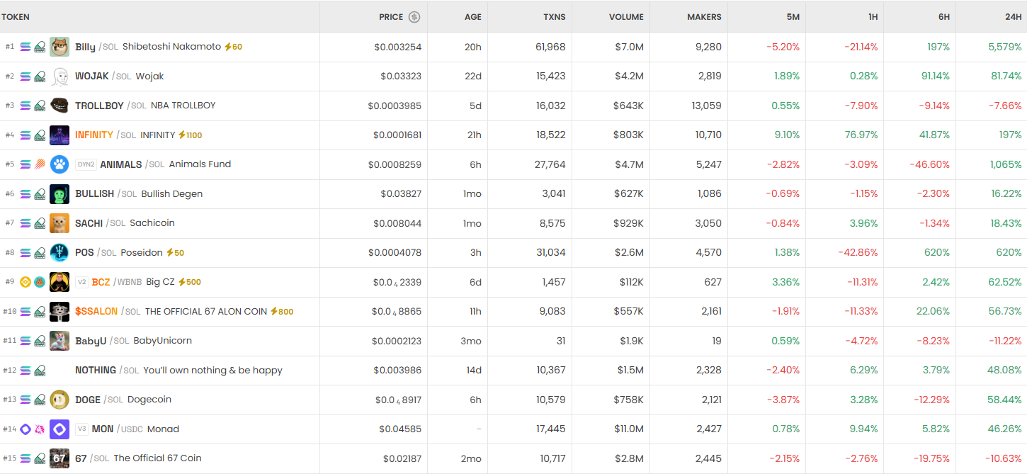 去中心化交易所热门交易动态 今日去中心化交易所中最受关注的交易对包括Billy、WOJAK和TROLLBOY。截至25日数据显示,热门交易榜首位由Billy/SOL占据,交易价格为0.003206美元,6小时涨幅达179%,24小时涨幅高达5,495%。该交易对成交量达到700万美元,累计交易次数62,007笔,展现出强劲的市场活跃度。 热门交易榜单 位列第二的WOJAK/SOL交易价格为0.03310美元,6小时上涨91.91%,24小时涨幅76.44%。该交易对成交量达420万美元,总交易笔数15,424次,持续保持资金流入态势。 排名第三的TROLLBOY/SOL交易价为0.00040 -