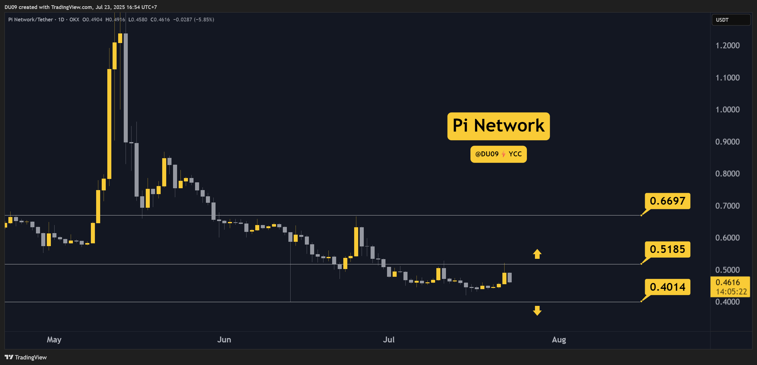 Pi网络代币价格走势分析与本周预测 关键支撑位:0.40美元、0.44美元 关键阻力位:0.52美元 1. 下行趋势仍未结束 PI代币昨日曾强势冲击0.52美元阻力位,但遭遇强烈抛压。空头力量迅速反扑,导致该加密货币价格回落至0.46美元。此次冲高未果后形成的较低高点表明,当前下行趋势可能仍将持续。 2. 买方力量正在积聚 当前价格走势中一个积极的信号是买方兴趣持续升温,交易量出现明显放大。这已是七月份多头第二次尝试突破0.52美元关口。若此次回调后买盘压力能够维持,第三次突破尝试或将取得成功。否则,0.44美元和0.40美元将成为重要支撑位。 3. 日线RSI指标受阻于50中轴 自五2025-07-23 -