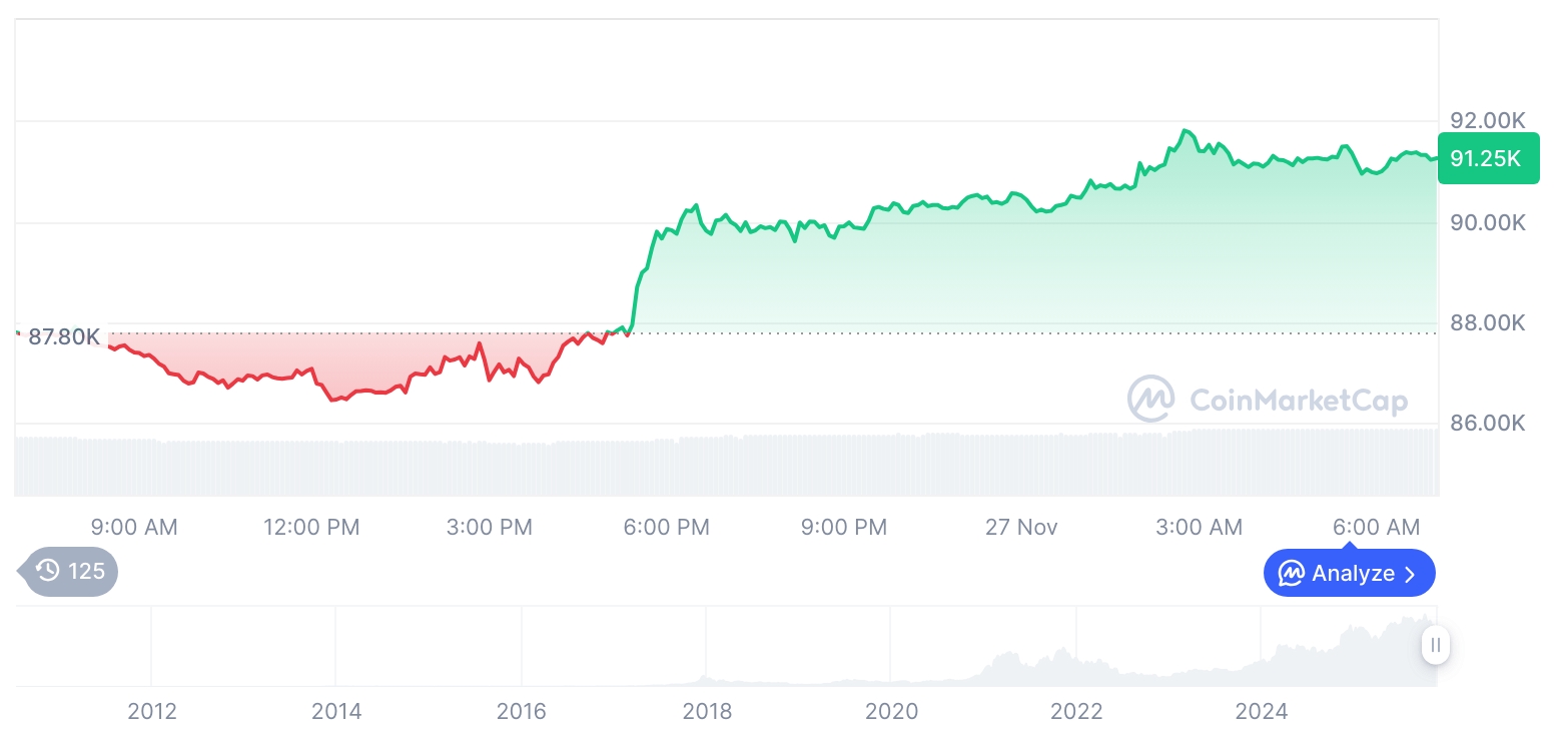 比特币突破九万美元关口,山寨币跟涨但季节未至 比特币价格正攀升至备受期待的90,000美元关口上方,以太坊、瑞波币、Solana和狗狗币也随之上涨。但分析师强调,主要趋势仍处于下行通道,经典的山寨币季节可能为时尚早。 市场强势反弹背后的隐忧 经历周末大幅抛售后,加密货币市场在新一周迎来强劲复苏。比特币重新站稳89,000-92,000美元区间,同时投资者对美联储12月降息的预期推动了股票和加密资产的买盘。过去24小时内,BTC上涨约3.9%,以太坊上涨3.4%,瑞波币涨幅超1%,Solana与狗狗币均上涨约2%。 数据显示本轮上涨的背景是空头头寸清算。过去24小时共清算3.65亿美元头寸 -