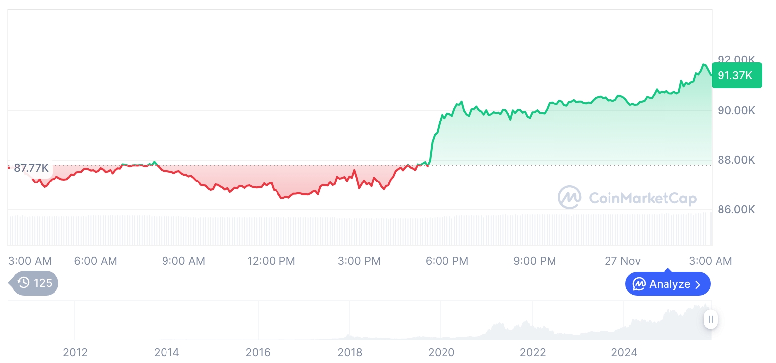 [午市简报]加密货币市场普涨:比特币报91,399美元,以太坊突破3,038美元