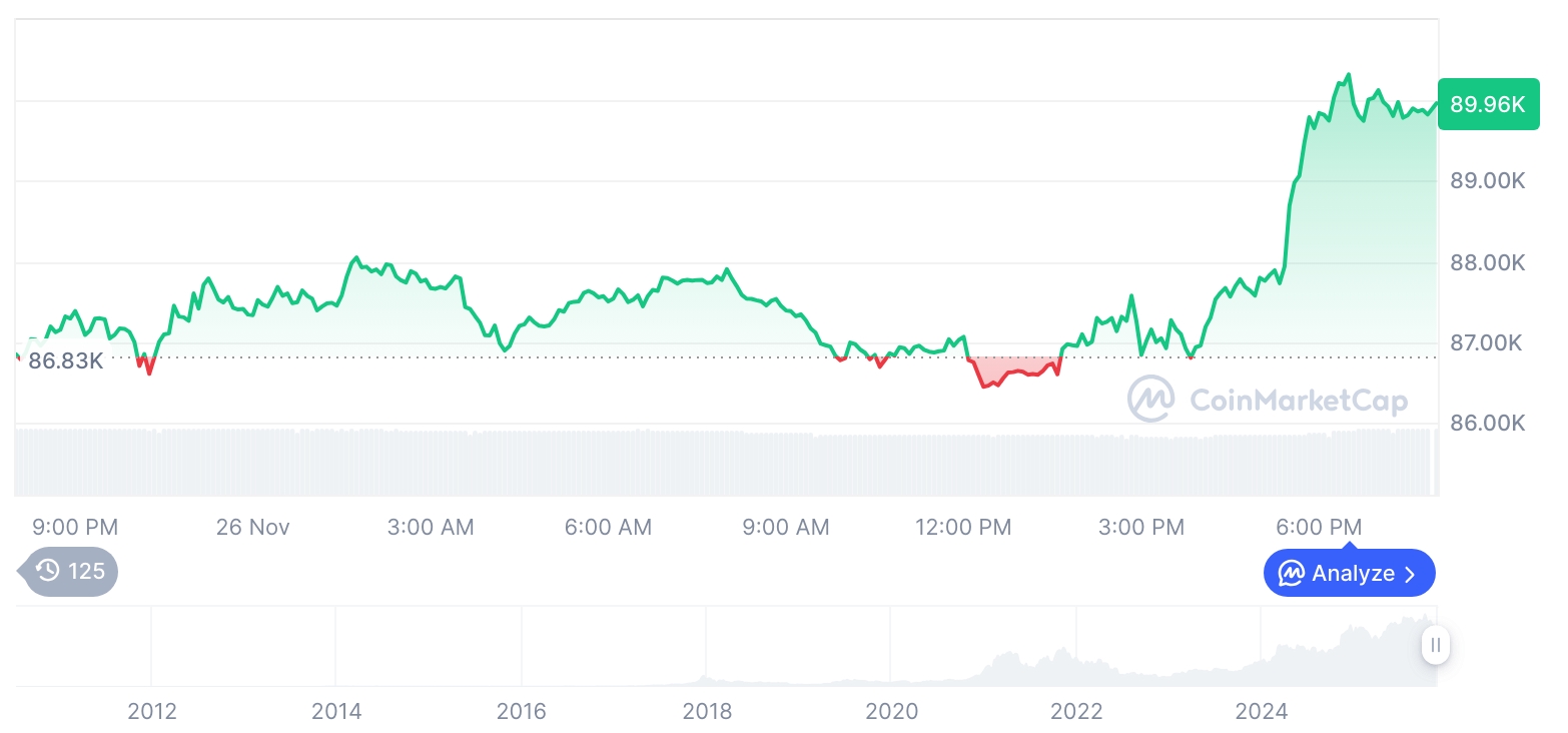 【晨间行情简报】加密货币市场普涨:比特币报89,963美元,以太坊触及3,033美元