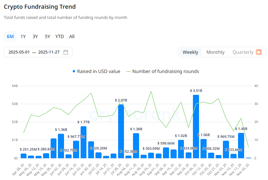 加密货币市场强势回暖,单周融资额突破14亿美元 上周加密货币行业出现大规模投资复苏趋势,风险投资金额达到14亿美元。据行业数据统计,在最近一周内共完成22轮投资交易,募集资金总额约14亿美元(约合2.05万亿韩元)。与前期(14轮,2.24亿美元)相比,本轮投资规模和交易数量均呈现显著增长。交易数量在一周内从14起增至22起(增幅57%),融资额从2.24亿美元跃升至14亿美元(增幅525%),显示出市场正在重新获得大量资金注入。 重点投资案例 本周最大规模投资花落美国预测市场平台Calcida,该平台在红杉资本参与的融资轮中成功募集1亿美元。交易所Kraken则成功获得Citadel Se2025-11-27 -