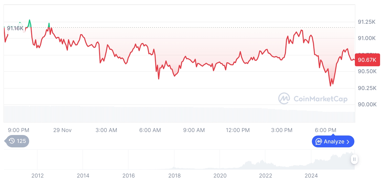 [早间行情简报]加密货币市场普跌:比特币报90,683美元,以太坊失守3千美元关口