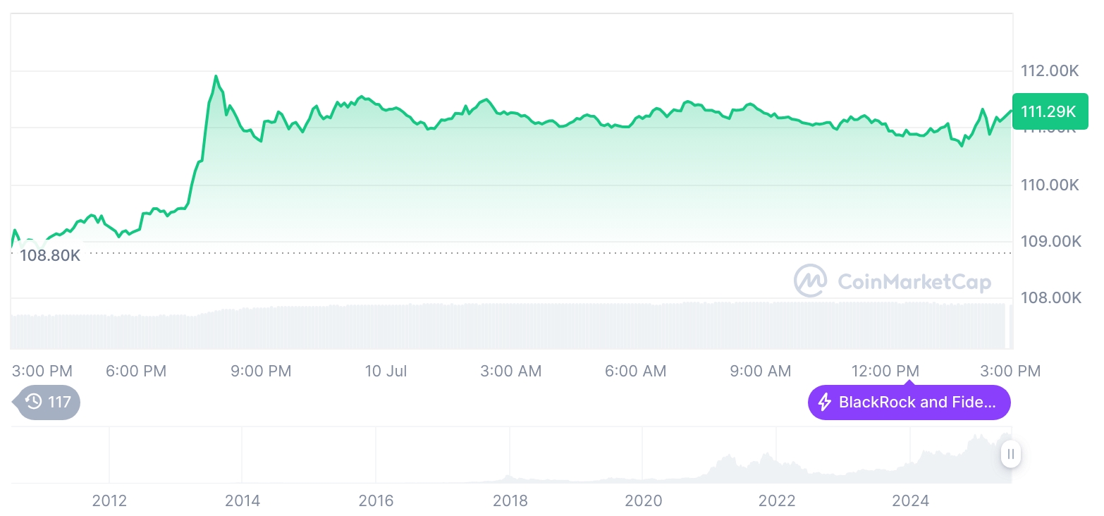 《午夜行情快报》加密货币市场持续上扬…比特币报111,286美元,以太坊达2,777美元