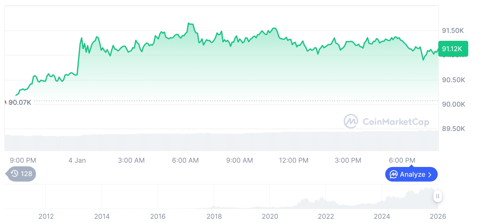 加密货币市场呈现分化走势2026年1月5日,加密货币市场出现分化态势。比特币虽一度重返91,000美元关口,但在发稿时仍小幅低于该水平。以太坊及多数主流山寨币普遍上涨形成强势格局,但去中心化金融市场却呈现跌势,释放出矛盾信号。主要币种表现比特币报91,123.81美元,日内涨幅1.18%;以太坊交易价3,132.77美元,上涨0.71%。狗狗币(5.78%)、瑞波币(3.82%)、卡尔达诺(2.55%)、Solana(1.33%)、BNB(1.77%)及波场(0.26%)等主流代币均实现同步上涨。当前加密货币总市值达3.11万亿美元,其中比特币市值占比58.49%,以太坊占比12.15%。市场 -