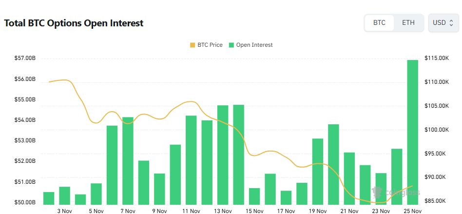 比特币期权市场未平仓合约激增,看涨情绪高涨 比特币期权市场未平仓合约量急剧上升,大量头寸集中在10万美元以上的看涨期权,反映出市场短期看涨预期增强。 截至25日9时,据CoinGlass数据显示,比特币期权未平仓合约总额为569.3亿美元,较前一日(526.1亿美元)增长8.20%。 比特币期权交易量约为85.6422亿美元。具体来看:Deribit为67亿美元,CME为2.6335亿美元,OKX为6.1533亿美元,Binance为6.2774亿美元,Bybit为3.5780亿美元。 未平仓合约结构及交易量分析 未平仓合约构成中,看涨期权占62.10%,看跌期权占37.90%,看涨期权的主导2025-11-25