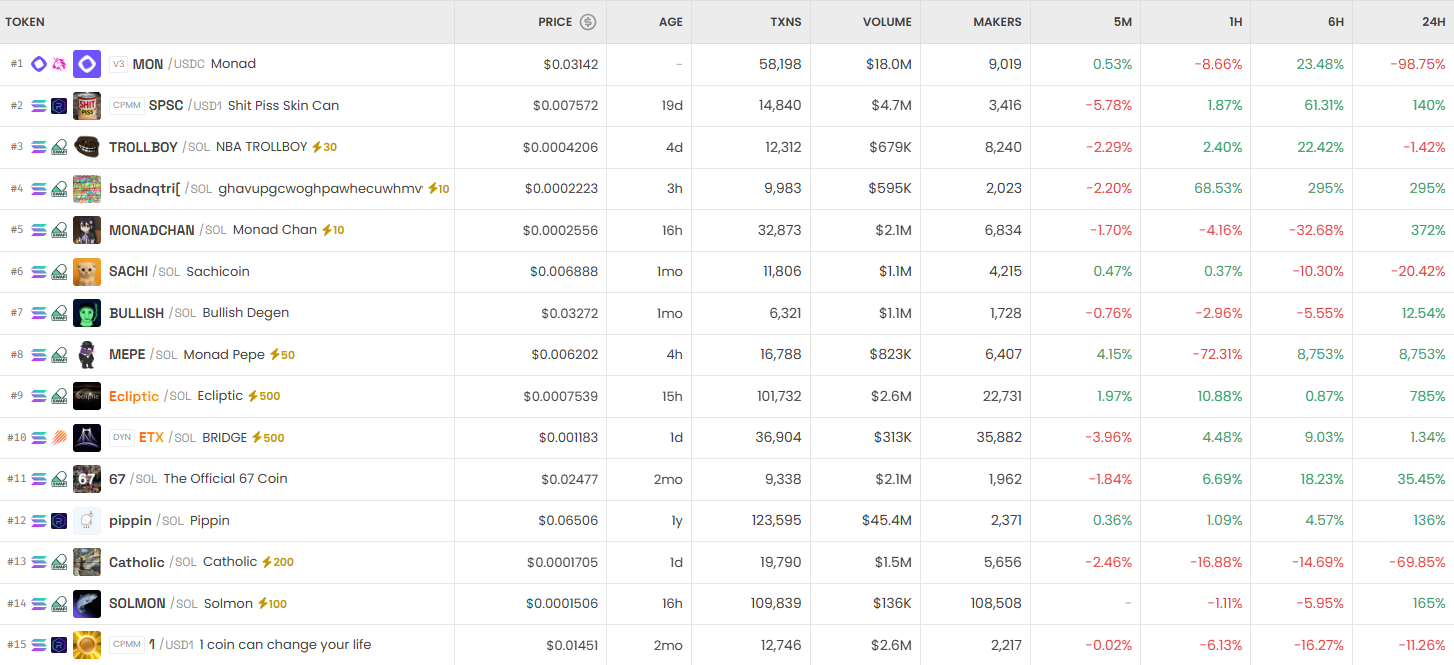 去中心化交易所热门交易对 本日最受关注的交易对包括MON/USDC、SPSC/USD1和TROLLBOY/SOL。截至25日数据显示,交易量榜首的MON/USDC报价0.03130美元,6小时涨幅23.00%,但24小时跌幅达98.75%。位列第二的SPSC/USD1交易价格为0.007402美元,单日暴涨135%。排名第三的TROLLBOY/SOL现价0.0004206美元,24小时微跌1.42%。 暴涨与暴跌标的 (筛选条件:交易量≥10万美元,流动性≥25万美元) 日内涨幅冠军machi mode/WBNB飙升281%,现报0.004733美元。SPSC/SOL以141%的涨幅紧随其后 -