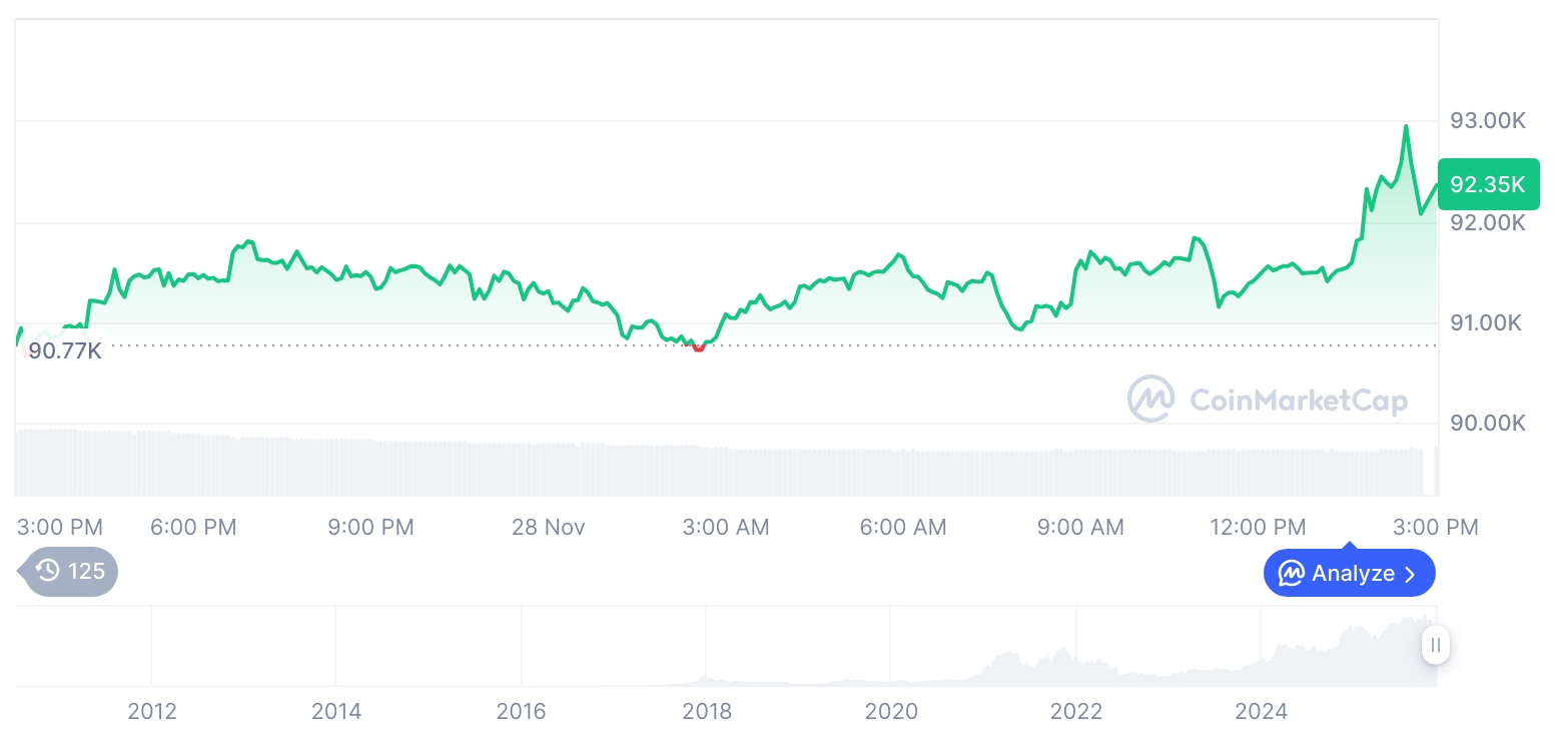 加密货币市场呈现震荡态势 截至2025年11月29日韩国时间上午,加密货币市场呈现震荡格局。据市场数据显示,比特币较前日上涨1.58%,报92,224美元(约合1.35亿韩元)。以太坊上涨2.32%,报3,066美元(约合450万韩元)。 主流代币价格走势 多数主流代币呈现上涨趋势。 市场规模与交易量 加密货币总市值达3.1377万亿美元(约合4608万亿韩元)。过去24小时交易量约为1150亿美元(约合169万亿韩元)。 市场份额变化 比特币市场份额达58.63%,较前日上升0.10%。以太坊市场份额为11.79%,较前日下降0.10%。 去中心化金融与稳定币市场 去中心化金融市场出 -