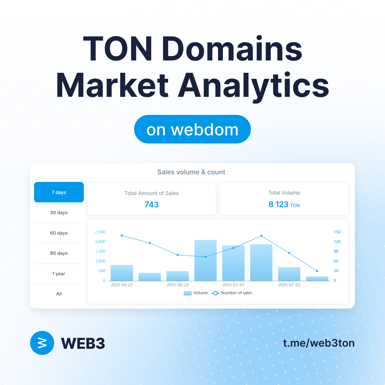 6月27日至7月3日TON域名市场走势分析 .ton域名交易区表现 在交易笔数保持稳定的情况下,交易总额与平均售价均呈现显著增长——这预示着高净值买家的回归。 交易总额:+34.12%(从6,148.79 TON增至8,246.94 TON) 资金流入激增而销售数量稳定,表明优质投资者参与度提升。 成交笔数:+7.28%(从687笔增至737笔) 在价格上涨背景下仍保持稳定活跃度,彰显市场需求健康。 平均价格:+28.43%(从9.2 TON升至12 TON) 单笔交易金额增长反映市场向优质、收藏级或品牌级域名转移。 t.me用户名交易区动态 经过炒作驱动的暴涨后,用户名市场正经历显著降温2025-07-07